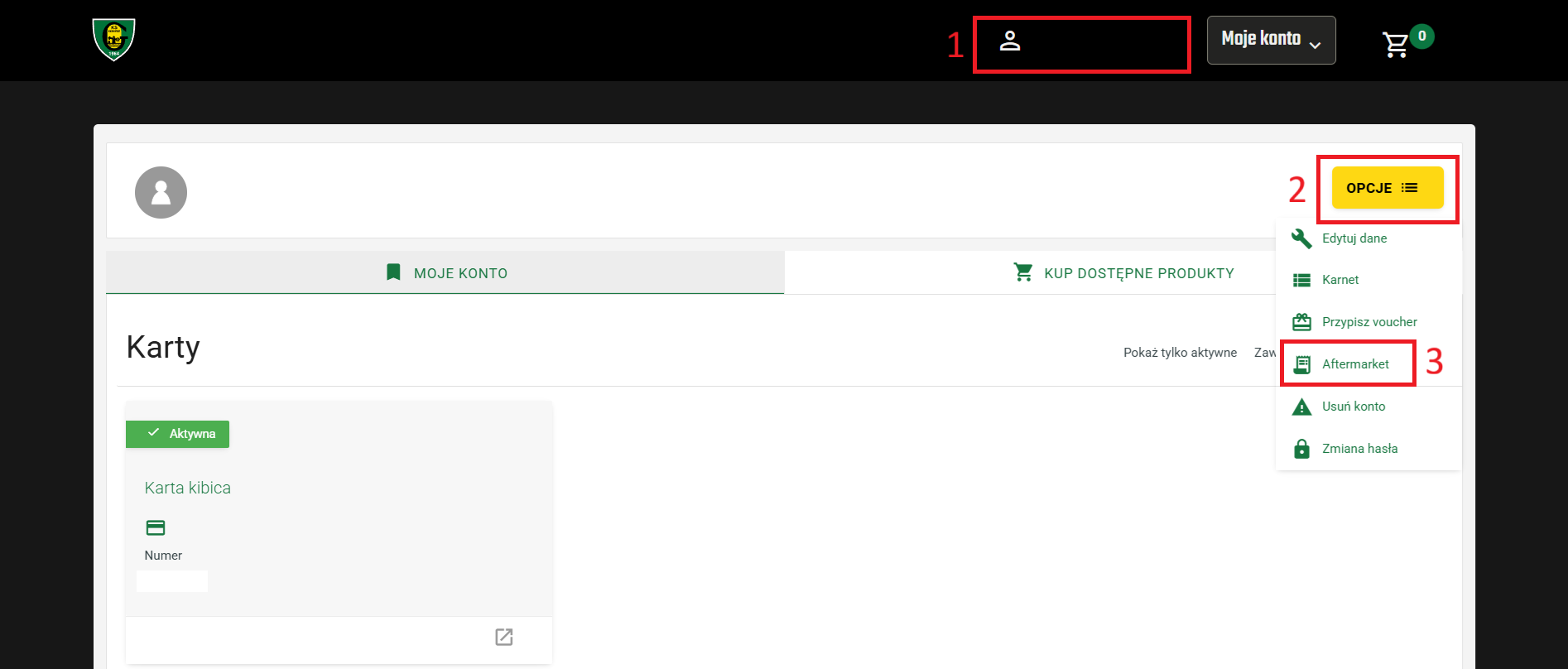 1. Wejdź na stronę bilety.gkskatowice.eu i zaloguj się na swoje konto. Przejdź do karnetu i wybierz ikonkę w dolnym prawym rogu aby przejść do jego szczegółów.